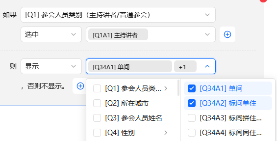我需要部分前置选项来解锁后面部分题目的选项,比如图中报名时,如果报名人是主持讲者,那么允许报名人单人住宿。