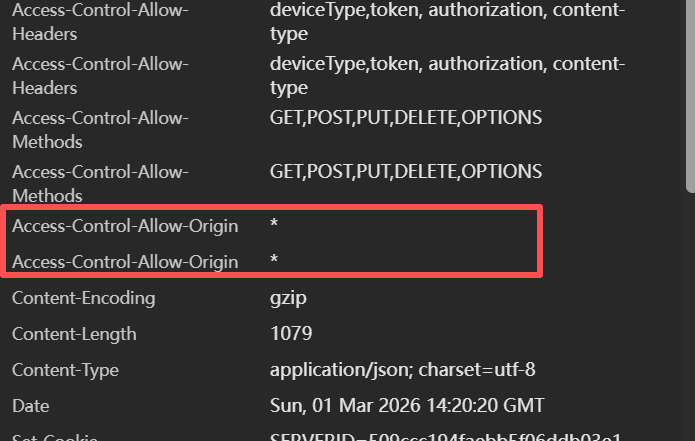 如图所示,使用相同的请求,返回的头有时候只有一条Access-Control-Allow-Origin * ,此时可以直接获取到正确的响应;有时会返回两条Access-Control-Allow-Origin * ,导致浏览器提示跨域权限错误;因为是数据库部分节点返回正确/部分返回不正确的问题,请问能否解决?